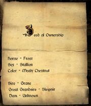 Promises to Keep is a quest available in The Elder Scrolls V: Skyrim in which the Dragonborn must steal the lineage papers of the horse Frost and bring him to Louis Letrush.